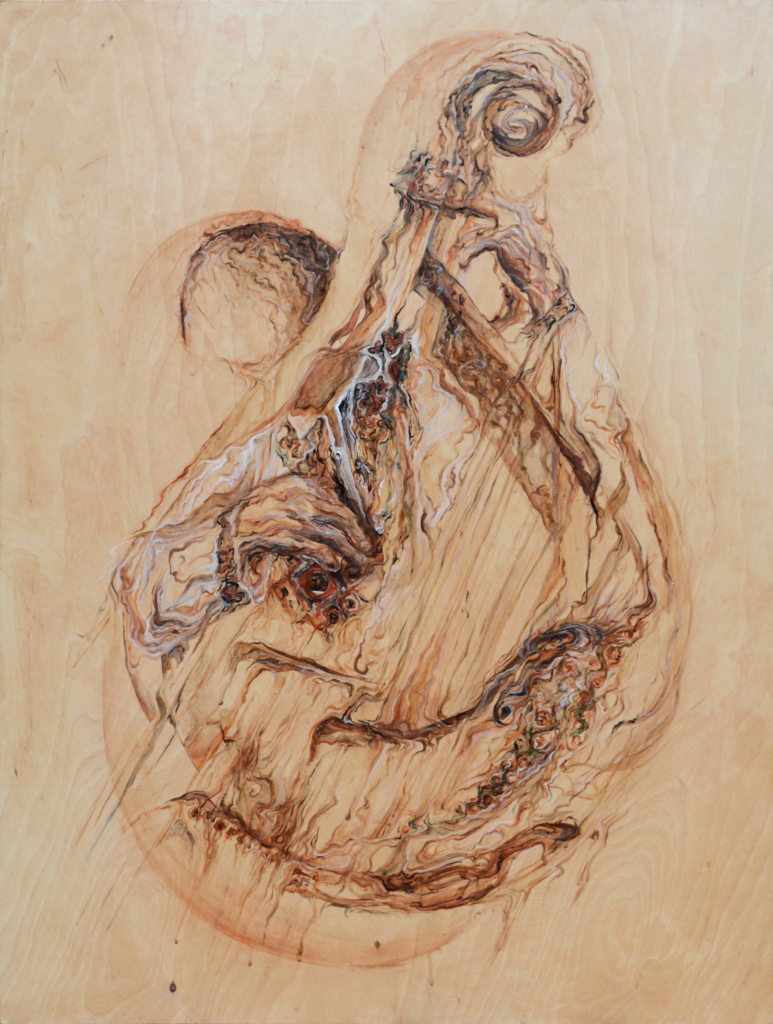 Diana Nadia Lawryshyn is a Ukrainian-Canadian artist based in Toronto. Her wood grain-based paintings explore pareidolia: the human impulse to derive images and meaning from ambiguous forms. Beginning with an abstract, gestural underpainting, each painting evolves as faces, figures, and other forms emerge through her response to the natural patterns embedded in the wood grain.