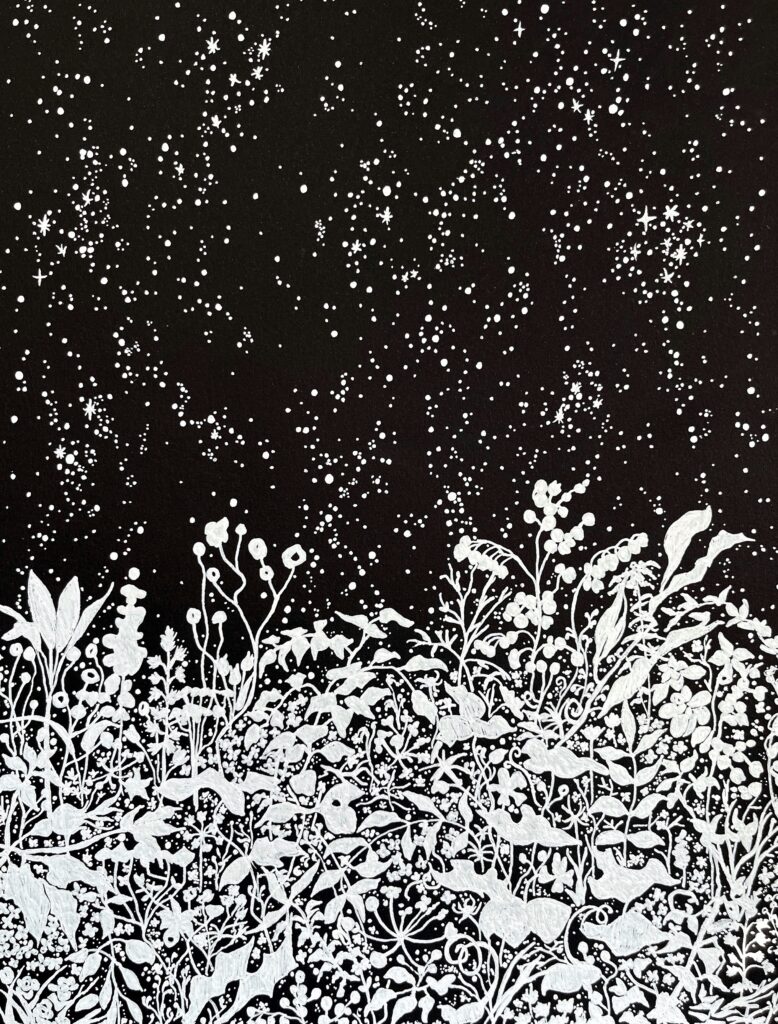 Sereen’s artistic practice is rooted in a desire to create beautiful scenes, whether personal, cultural, or imagined, that evoke a sense of wonder and introspection, and the quiet allure of nature. She primarily works in gouache, oil, and ink, and draws inspiration from the natural world, old storybook illustrations, surrealist imagery, and bold, moody colour palettes.